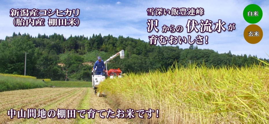 生産しているのは新潟県胎内市。沢からの伏流水、肥沃な土壌、そして昼夜の寒暖差と、米作りの最適な地理的条件が揃った場所で栽培した棚田米です!