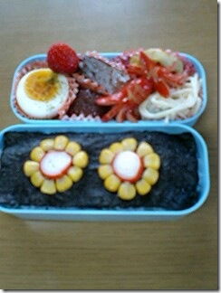 コシヒカリのご飯の上に海苔とコーンとチーズ入りのカマボコでひまわりです。