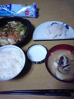 おかずは、イカのお刺身、店屋物の肉野菜炒めです。