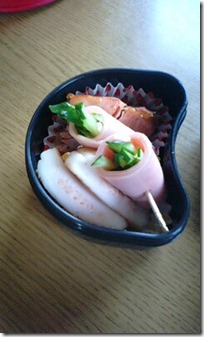 - おかずは、卵焼き、ウインナー、ほうれん草の胡麻和え、塩引鮭、キューリを巻いたハム、ハンペンです。