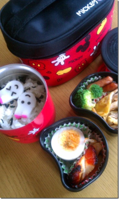 - コシヒカリのご飯の上に、ふりかけ、ウサギ型のカマボコです。