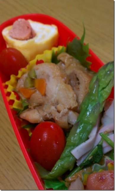 おかずは、明太子入りの卵焼き、トマト、お野菜入りの鶏煮込み、アスパラ、ハム野菜炒め、ウインナー、レンコン、キューリ入りのチクワです。