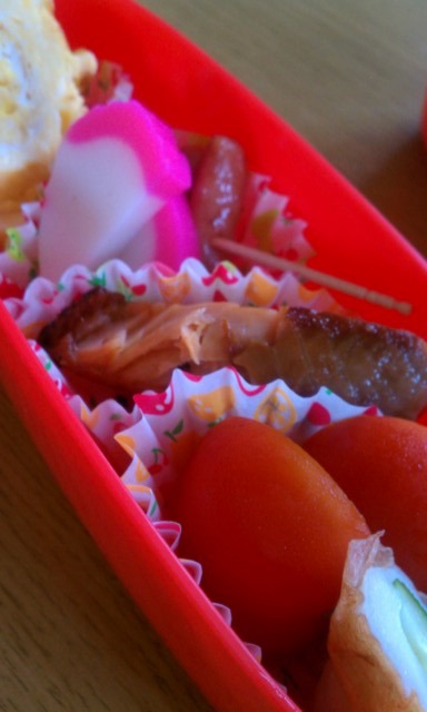 おかずは、卵焼き、塩引き鮭、カマボコ、ウインナー、トマト、キューリ入りのチクワです。