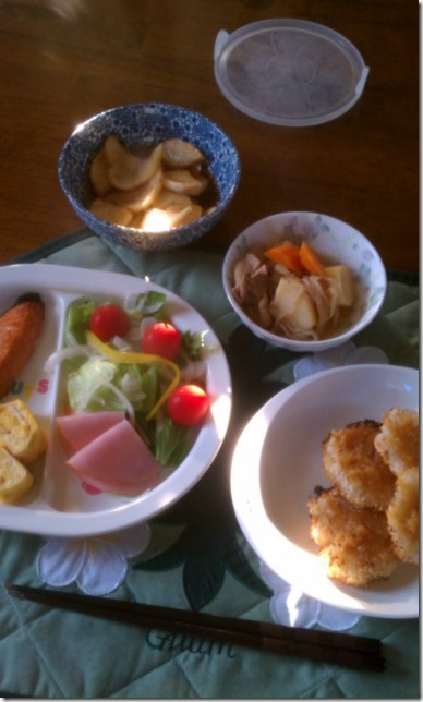 おかずは、塩引き鮭、卵焼き、ハムサラダ、肉じゃが、ダイコンのお漬物です。