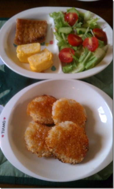 おかずは、サラダ、卵焼き、鮭の焼き漬けです。