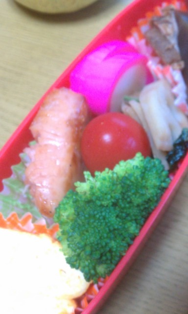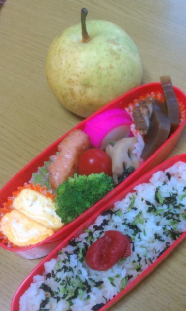 おかずは、塩引鮭、卵焼き、ブロッコリー、トマト、カマボコ、レンコンとホウレン草の炒め物、煮コンニャク、デザートに梨です。
