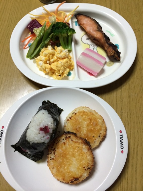 おかずは、塩引き鮭、サラダ、カマボコ、スクランブルエッグ、アスパラ、ブロッコリーです。