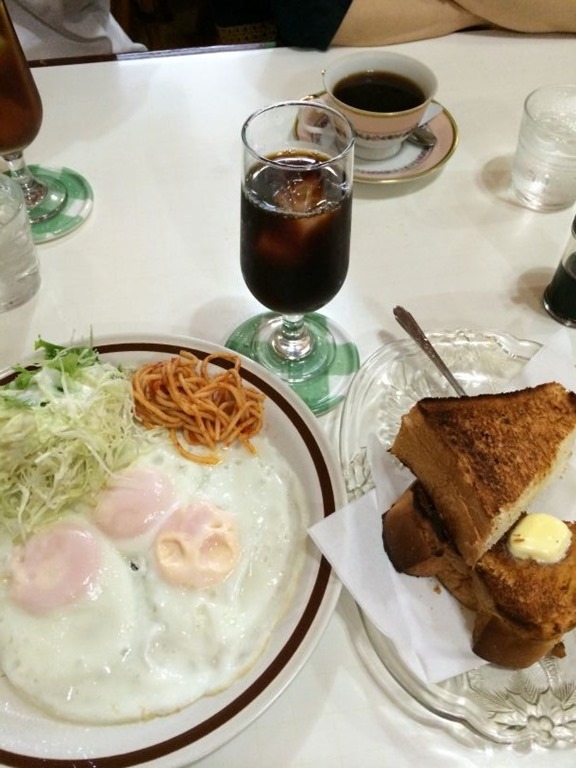 トースト、目玉焼き、サラダ、パスタ、ケーキ、アイスティです。