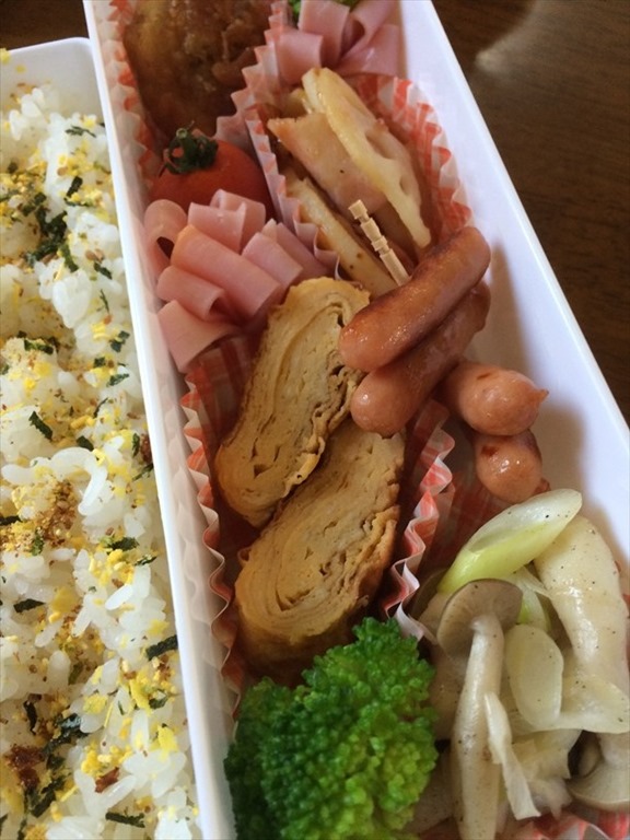 おかずは、唐揚げ、ハムのお花、レンコンとベーコン炒め、卵焼き、ウインナー、ブロッコリー、キノコとネギの炒め物です。